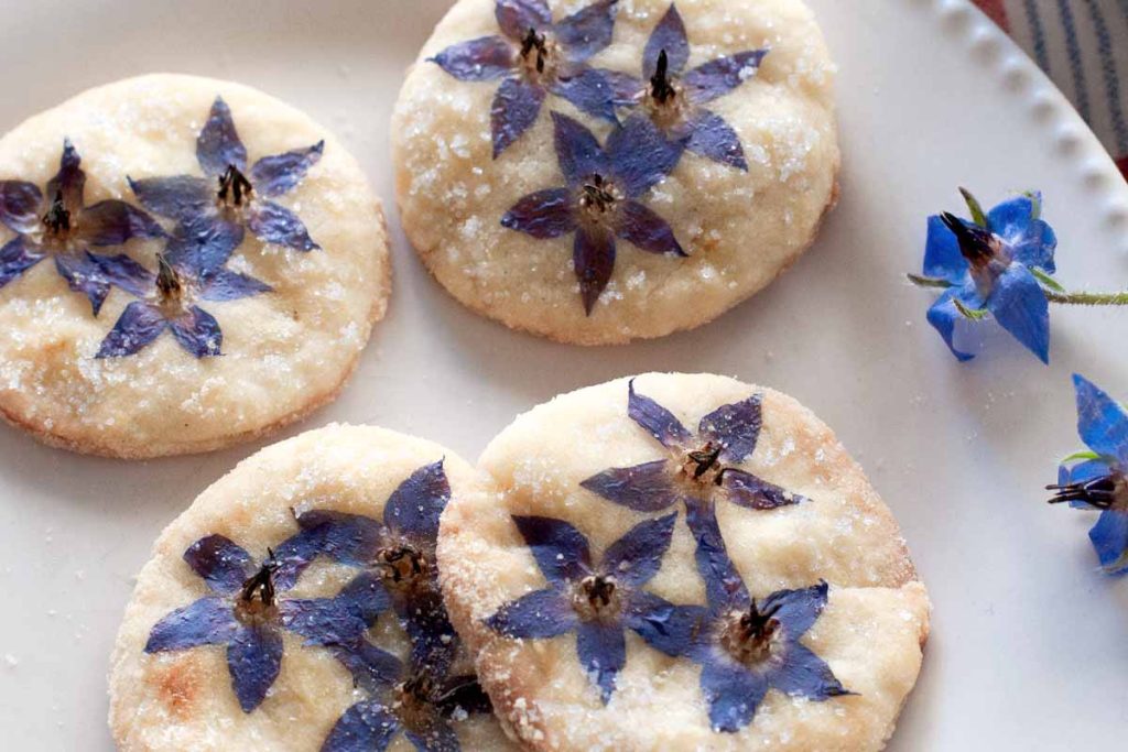 Best used fresh. Whole flowers are scattered over salads, chilled soups, soft cheeses, buttered vegetables, and cold desserts. They also hold their shape surprisingly well in baking — pressed gently into breads, biscuits, and savoury pastries, where they retain colour and add a graphic, almost botanical presence. Borage flowers are also frozen into ice cubes for drinks, where their blue remains striking and clear.