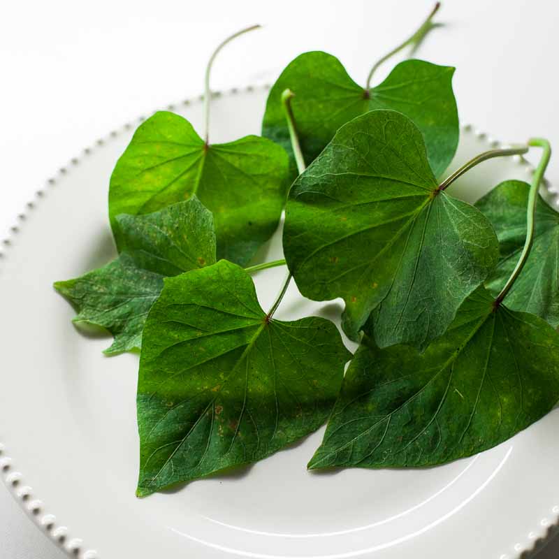 De sabor un poco amargo (que puede ser mitigado blanqueándolas), las hojas de batata morada pueden ser utilizadas: