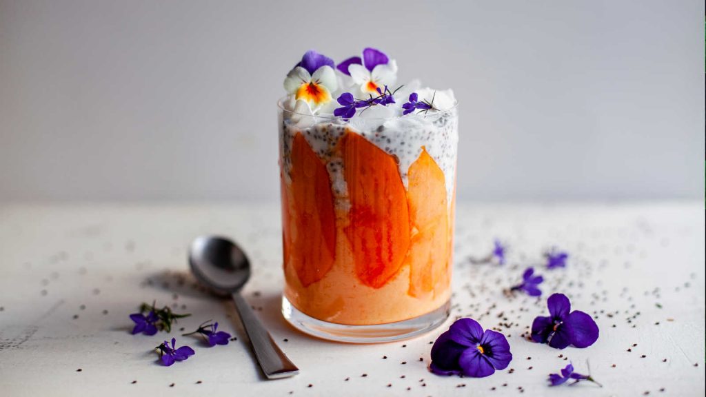 - Use texture as a counterpoint — velvety petals, tender crumbs, smooth purées, and glossy fruit deepen the colour’s presence and keep it firmly edible.