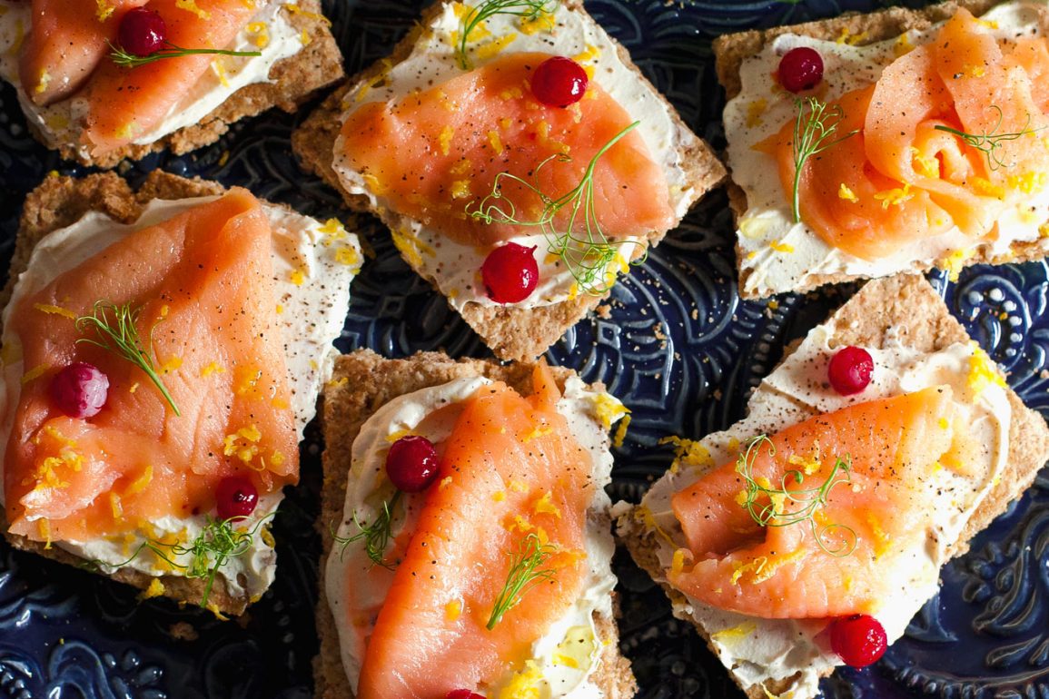 - Untar las crackers con el queso crema, agregar una feta de salmón ahumado y decorar con grosellas rojas. Espolvorear con más pimienta y ralladura de limón y servir inmediatamente.
