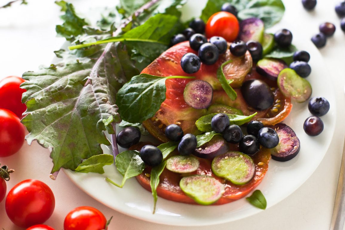 Ensalada de la huerta con arándanos, kale y tomatillos púrpura