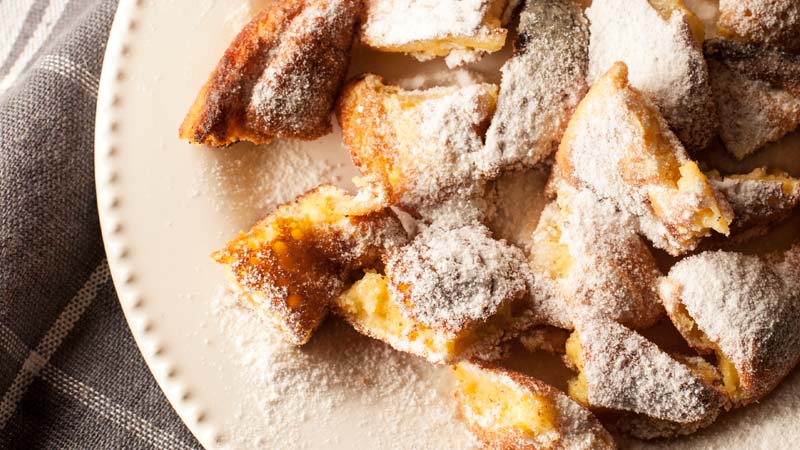 Cuenta la leyenda que los Kaiserschmarrn fueron creados en honor a Francisco José I de Austria, de ahí su nombre: Kaiser (emperador) y Schmarrn (plato revuelto). Conocidas en Hungría como Császármorzsa o Smarni (o Emperor's mess en inglés), estas tortitas cortadas y espolvoreadas con azúcar glas originalmente llevaban pasas maceradas en Rhum y eran acompañadas por compota de ciruela. Solas son una perfecta opción para un desayuno o brunch improvisado, ya que llevan unos pocos ingredientes, se preparan en un santiamén y combinan prácticamente con todo. Su textura esponjosa por dentro y crujiente por fuera se obtiene gracias al huevo y la mantequilla, y no llevan ningún tipo de polvo de hornear. Su sabor delicado hace que el sirope de lavanda se luzca como protagonista.
