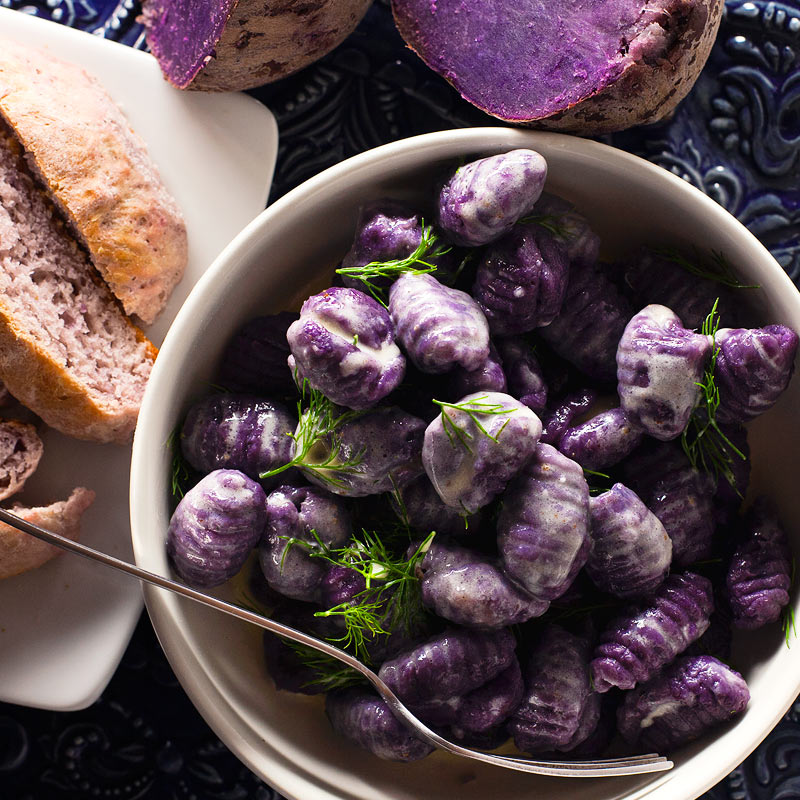 Esta receta de ñoquis de boniato púrpura (también conocido como camote, patata dulce o batata morada) no requiere tiempo de espera ya que la textura de esta variedad de boniato es más firme que las otras. Estos gnocchis no tradicionales por su llamativo color no requieren de ningún colorante artificial.