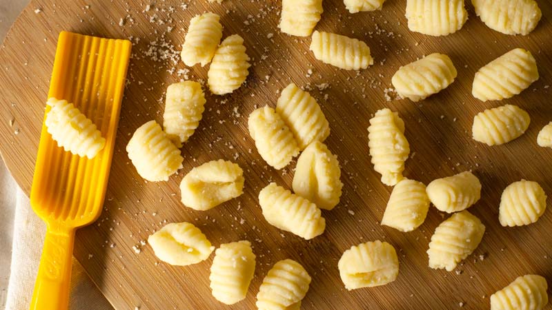 - Formar tubos, cortar con un cuchillo en segmentos de igual tamaño, y dar forma a los ñoquis con la ayuda de una tabla de ñoquis.
