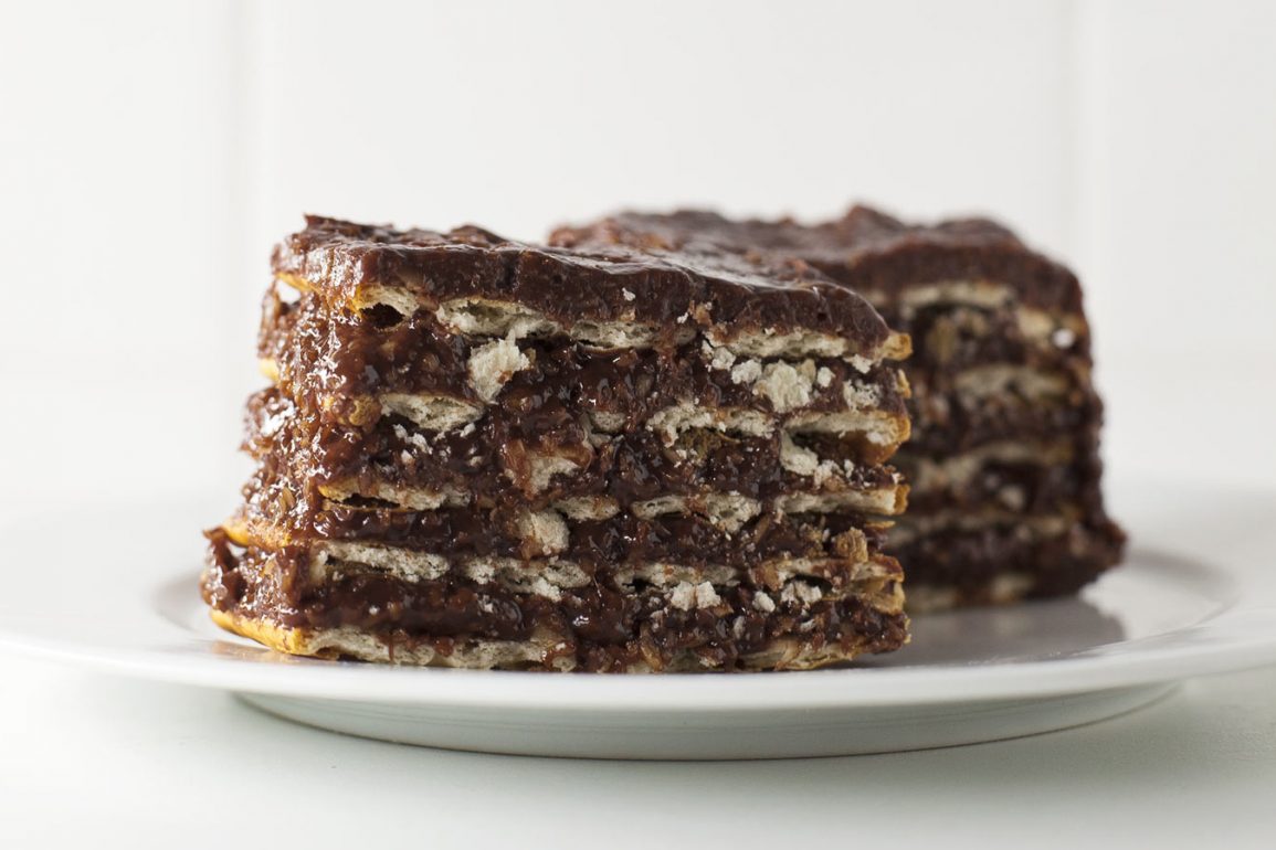 - Intercalar capas de mezcla de avena con capas de galletas hasta terminar con una capa de mezcla de avena y chocolate.